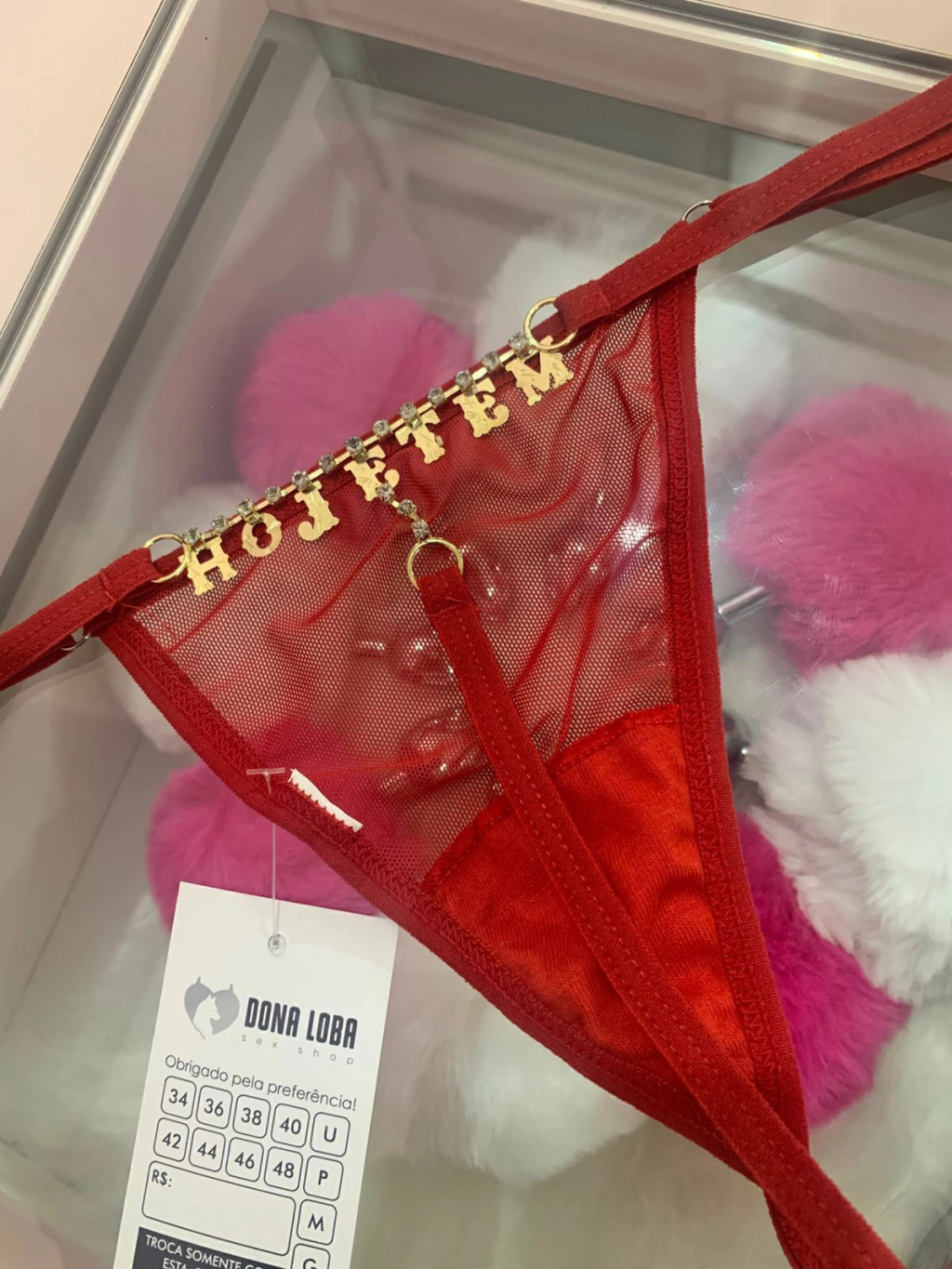 Calcinha tipo fio dental strass escrito HOJE TEM