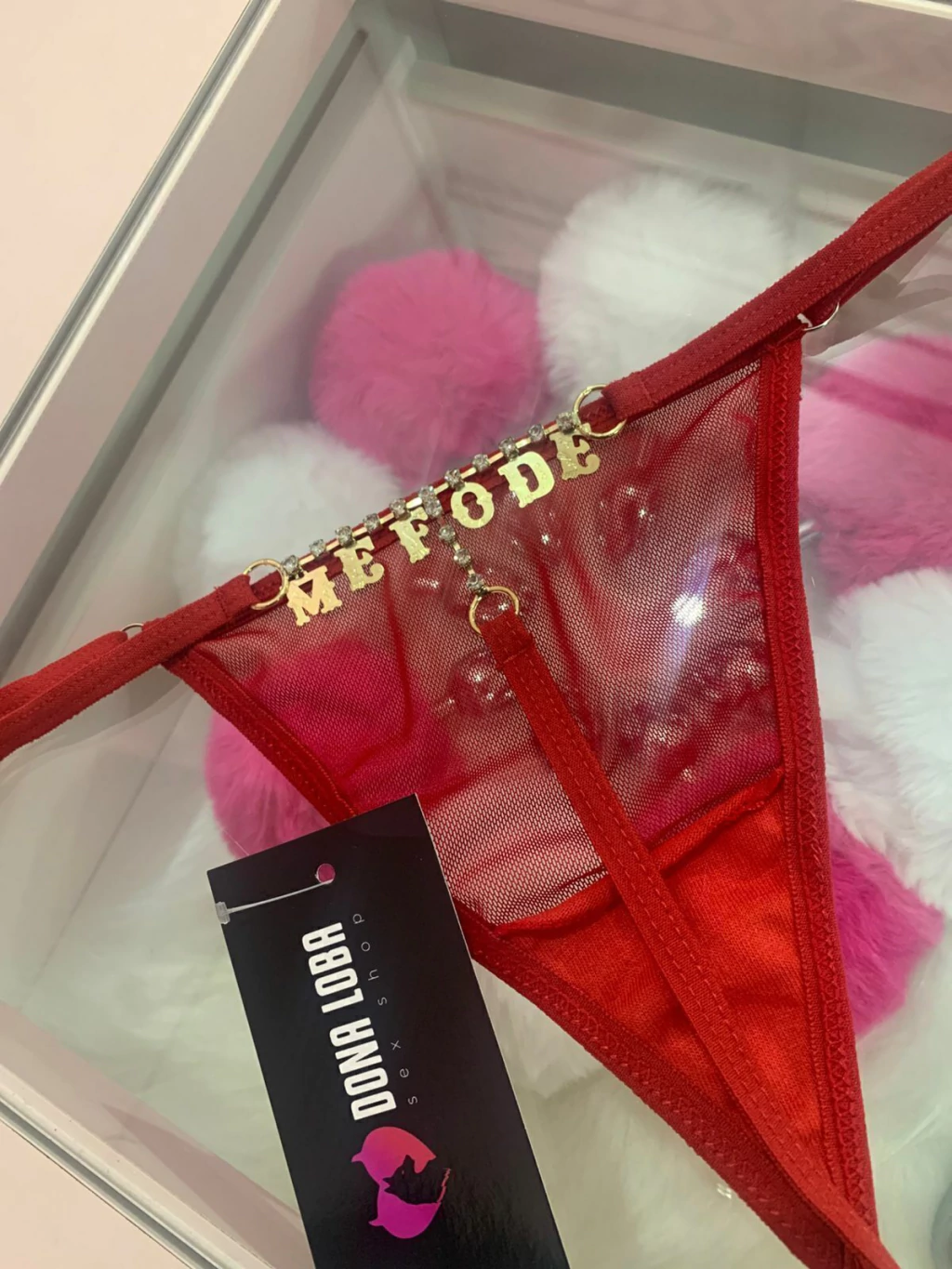 Calcinha tipo fio dental strass escrito ME FODE
