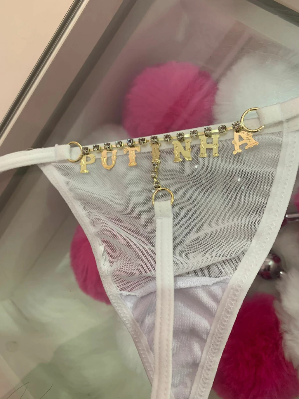 Calcinha tipo fio dental strass escrito PUTINHA