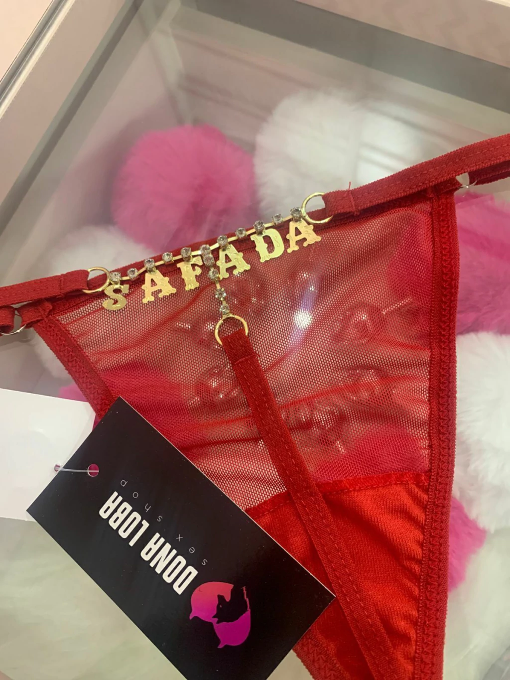 Calcinha tipo fio dental strass escrito SAFADA